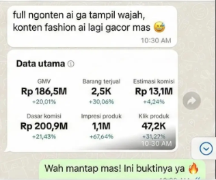 Pilih foto produk – Pilih style POV & vibe konten – Generate → upload → affiliate jalan